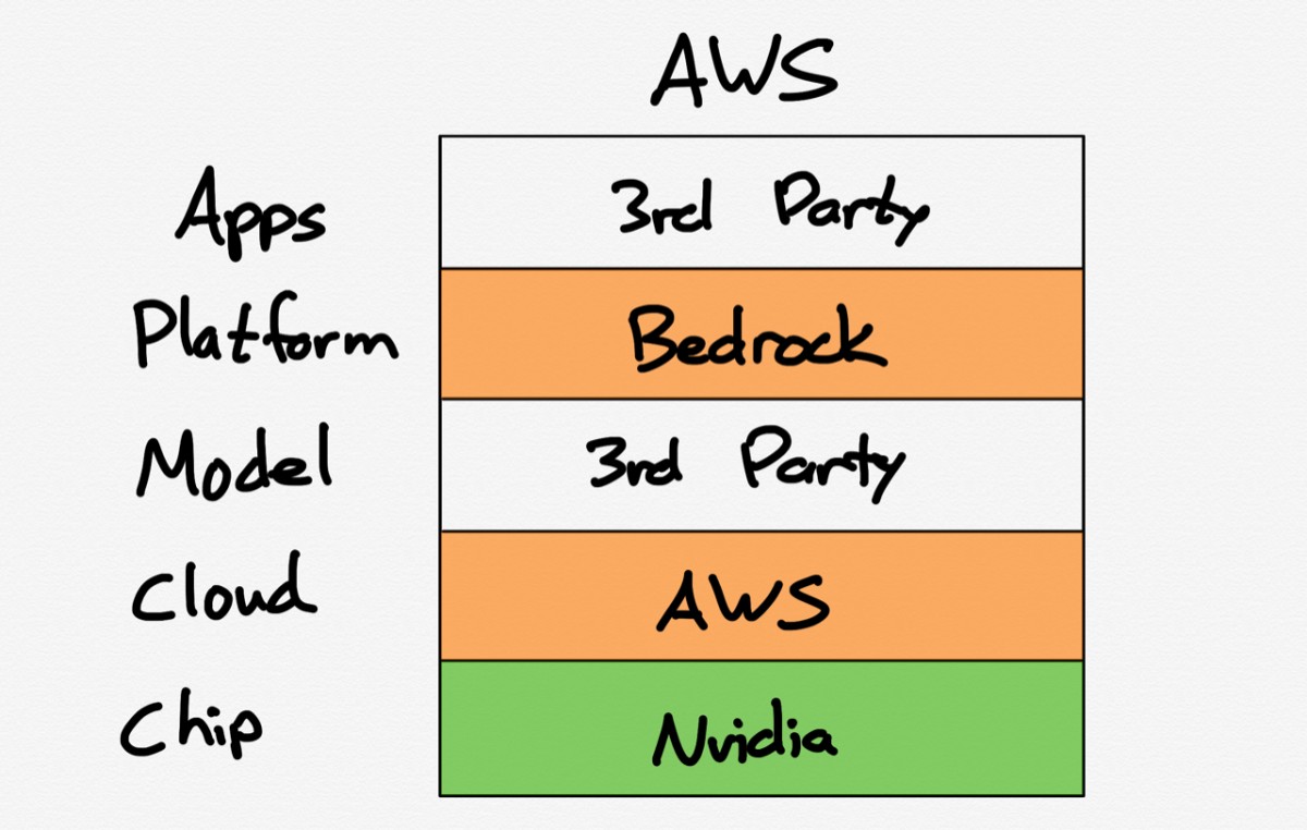AI業界では開発のスピードが著しく速まる中、企業は大きく二つの戦略に分かれています。一つは独自のソリューションを内製する方法、もう一つはサードパーティのプロダクトを統合し、新たな価値を生み出すアプローチです。例えばGoogleは、Tensor Processing Unit(TPU)プロセッサを用いたモデルトレーニングからアプリケーション開発に至るまで、全て自社のプラットフォームで完結する統合的なアプローチを採用しています。これに対してAmazonは、独自のモデルを開発するのではなく、Bedrockという開発プラットフォームの充実に注力しています。一方、AIチップ開発では、多くのビジネスがNvidiaのGPUを利用しています。